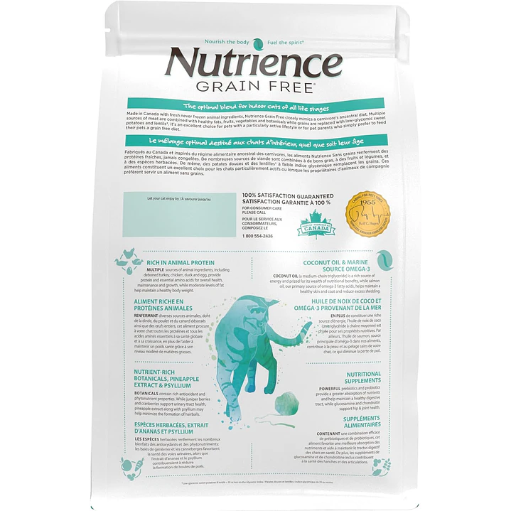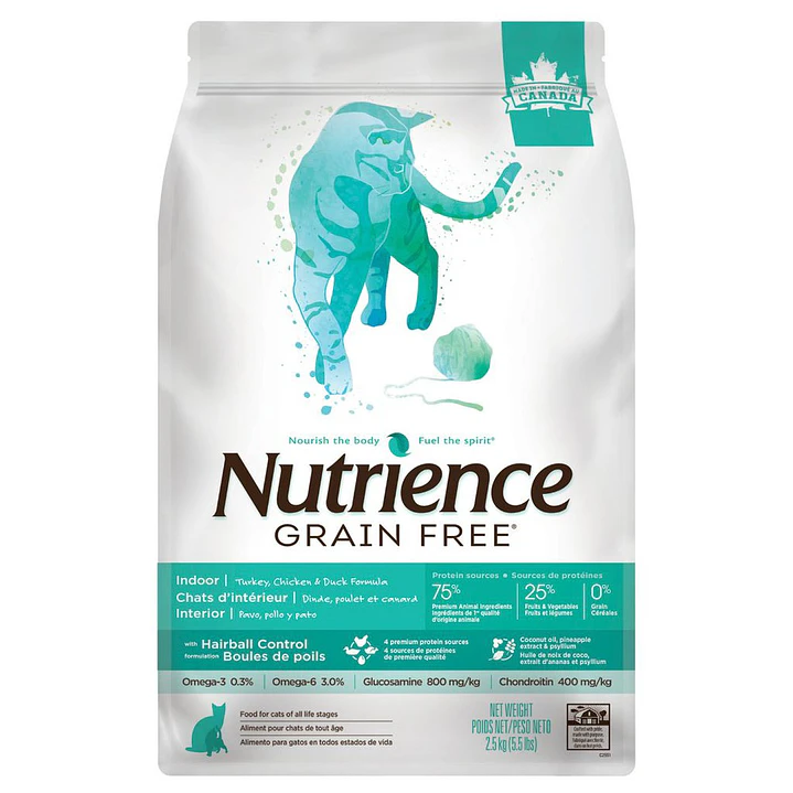 Nutrience Grain Free Indoor Formula for Cats is formulated to meet the nutritional levels established by the AAFCO Cat Food Nutrient Profiles for all life stages.